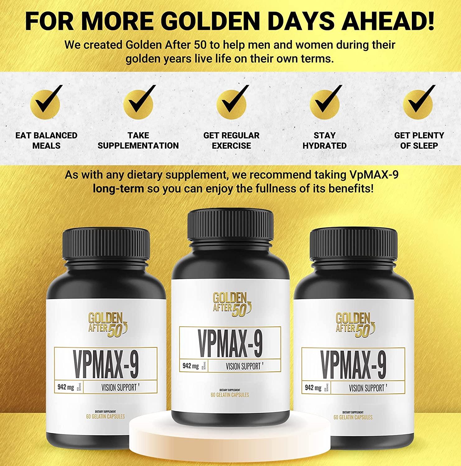 Golden After 50 Vpmax 9 Vision Support Supplement 60 Gelatin Capsules Eye Health Support And Antioxidant Supplement With Eye Vitamins Lutein Lycopene And Bilberry Extract 60 Count Pack Of 1